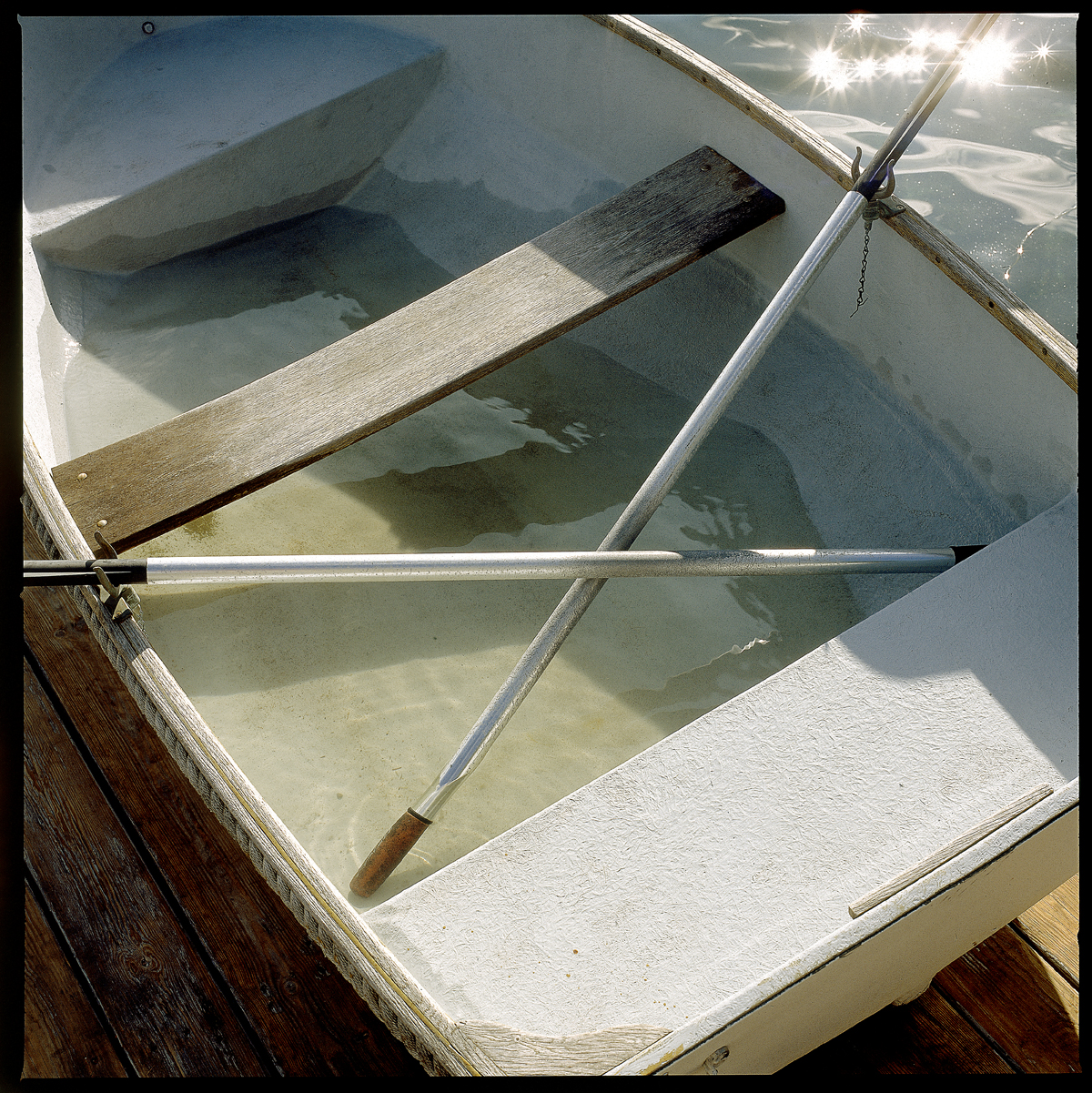 A short while ago, I was down-east Maine, up on Deer Isle in Penobscot Bay. I was tucked away in a cozy little cottage right on the rocky Maine coast. It was in early August, the sky was bright, and the weather warm. And of course, the air was briny from the breaking Atlantic ocean on the rocks near by. There was a small floating dock with this rowboat hauled up on it. I looked at it for awhile, then sat down on the bank above it, and looked at it some more. I watched the seagulls wheeling overhead, and I imagined being at sea just off the maine coast. Then I look out my Hasselblad, looked at the rowboat again, and I made one exposure. In The Day Books, Weston talks about feeling for the exposure. I’ve always believed in that: more than just the exposure, though. I like to imagine the image before I make the exposure or the capture.