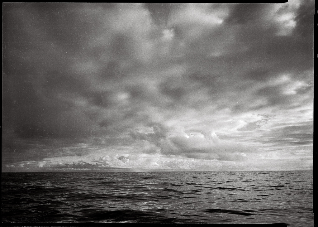 As I’ve said in a previous post, being at sea on a large sailboat is like being a NYC cop, 98.5% not doing to much other than your job, the other 1.5% of the time being scarred to death. This image made with my 5×7 Linhof is a good illustration of what days at sea are like. Obviously, we were nearly becalmed; and the planet’s eco-system is doing it’s job, evaporating water into the atmosphere until it condenses into rain showers or little squalls providing a dramatic afternoon “late show”. The wonderful thing about sailing on the ocean is how little effect you have on the biosphere, how little damage you do, you don’t even leave a foot print. One of the sad things about being a thousand miles offshore is seeing all the evidence of our collective disregard as stewards of our planet: there’s plastic and human manufactured crap floating everywhere. Any that’s just on the surface. What will take to stop polluting our oceans? (Oh, I have an idea: each nation contributing to the ocean’s pollution has to get it’s dumbass politicians and environmental policy makers out on sailing ships, and go out there and pickup all the crap floating around (funded from that nation’s defense budget): that would be a start.)
