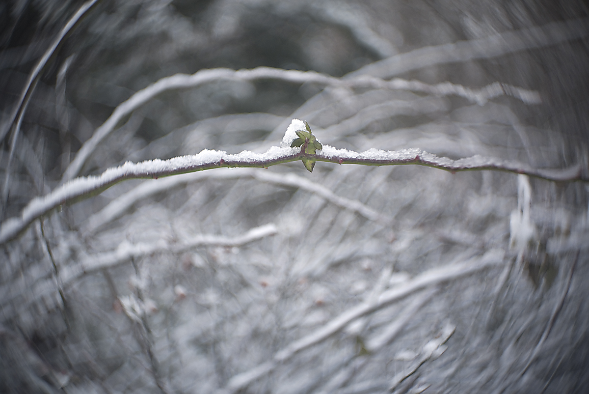 After the blizzard two weeks ago, everyone was a little edgy about the last night’s weather prediction for 2-7 inches of snow. Before I went to bed, I stuck my head out my kitchen door and I quickly realized that this was going to be a mere dusting. When I awoke this morning, everything outside had a dusty white coating. I had a cup of tea as I looked out my kitchen slider. I watched the cat that we’re cat-sitting checking out the new snow. So I picked up my little four thirds camera and screwed the tiny cine 25mm f1.5 onto it, and I went for a walk around my property. The bush and undergrowth is normally so thick that it is impossible to walk in many places. This is the only time of the year that I can easily access many of the nooks and crannies of my immediate environment. I made a bunch of captures this morning. I like this one because it’s a good visual ambassador for what my immediate surroundings look like.