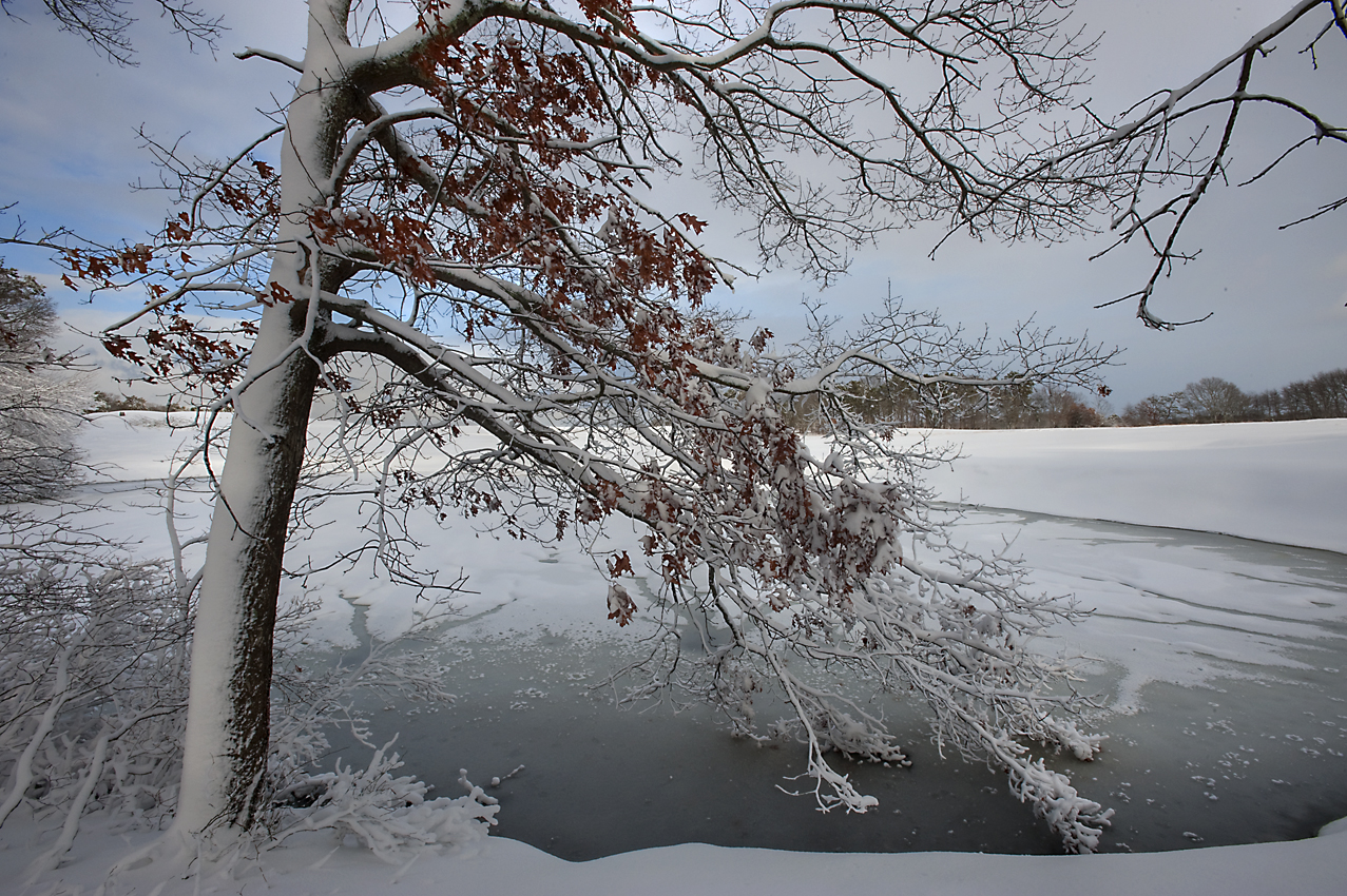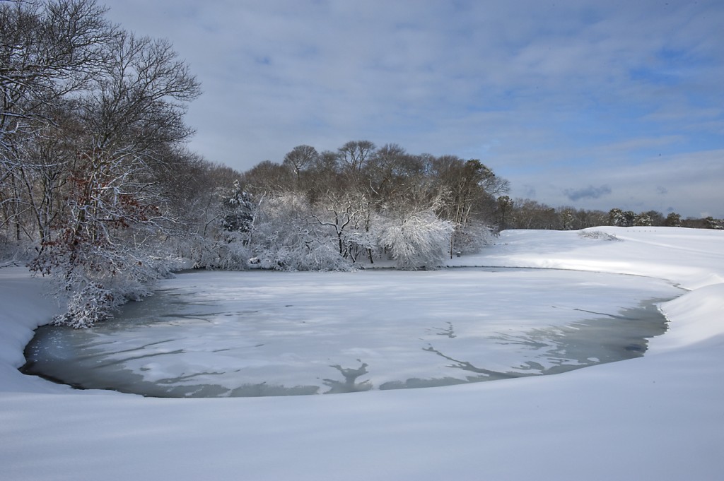 I’m house bound today, possibly for the immediate future. It snowed another foot or so last night, and with the high winds, there seems to be some significant snow drifts. Finally this afternoon, the sun broke through the clouds, and I went out to make a few captures. The little pond is on a golf course which borders my property, and it looked incredible in the weak afternoon light with just a little blue sky.