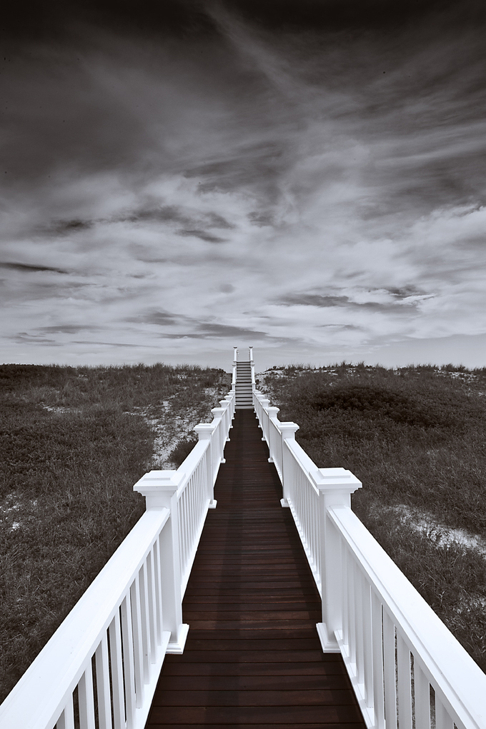 Today, I was photographing swimming pools for my pool company. For fourteen years, we’ve had a barter system whereby I photograph their newly constructed pools and, in return, they service and maintain my pool. After nearly a decade and-a-half, I can say without fear of contradiction that I am an expert at swimming pool photography. So this afternoon, I was at a brand new, 15000 square foot, “mac-man” lodged in the dunes overlooking the ocean. The pool was all right: I guess what made it somewhat photogenic was its location and its proximity to the ocean. But for about ten minutes, I became really preoccupied with photographing the walkway through the dunes and down onto the beach. The raw file capture below was rgb color, of course, but with a small digital back rub, I ended up with this image.
